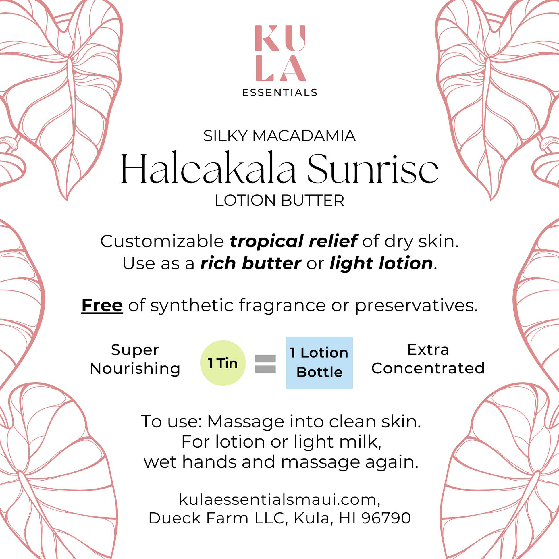 Silky instead of greasy. Concentrated and waterless. One tin of lotion butter is equal to a full bottle of lotion making it perfect for travel. Handcrafted with Hawai'i harvested macadamia oil, soothing organic kukui nut oil, and therapeutic essential oils.