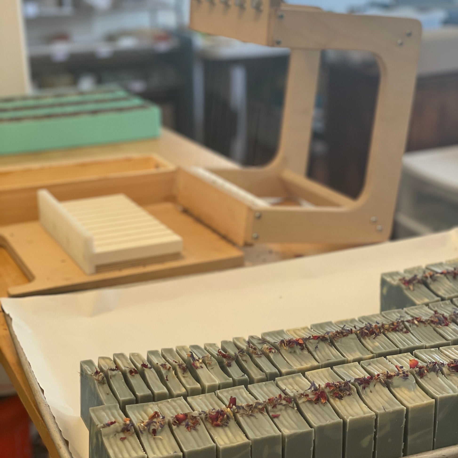 Color: Cream with a dusty blue swirl of soothing indigo extract. Topped with rose petals.
